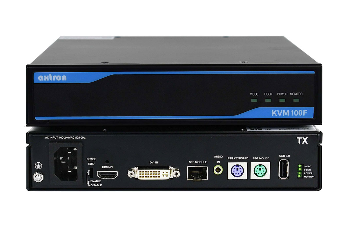KVM100F是一款面向工业自动化&轨道交通行业应用研发的一款KVM信号长线驱动器,核心采用高速FPGA芯片进行信号采集与编码,再通过使用单模&多模光纤作为载体将高清音视频与控制信号(包括:USB, PS/2键鼠,3.5mm立体声音频,DVI视频,HDMI视频等)依据不同通信距离的光模块,可以实现100米~80KM范围内的远程传输与控制。KVM100F最小工作单元是由发射机(TX)与接收机(RX)组成,发射机与接收机采用紧凑式结构设计,便于安装在远端操作台或紧凑空间内。